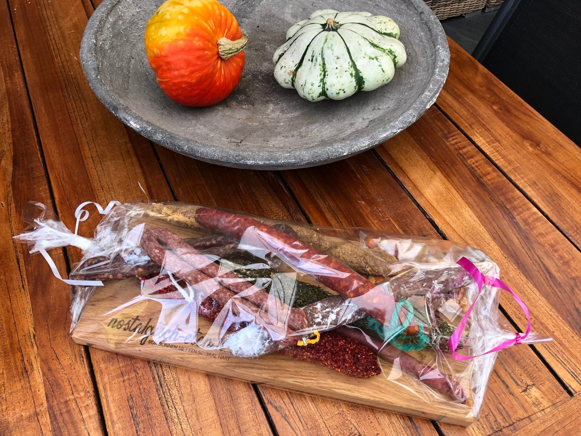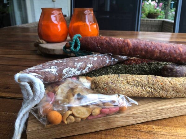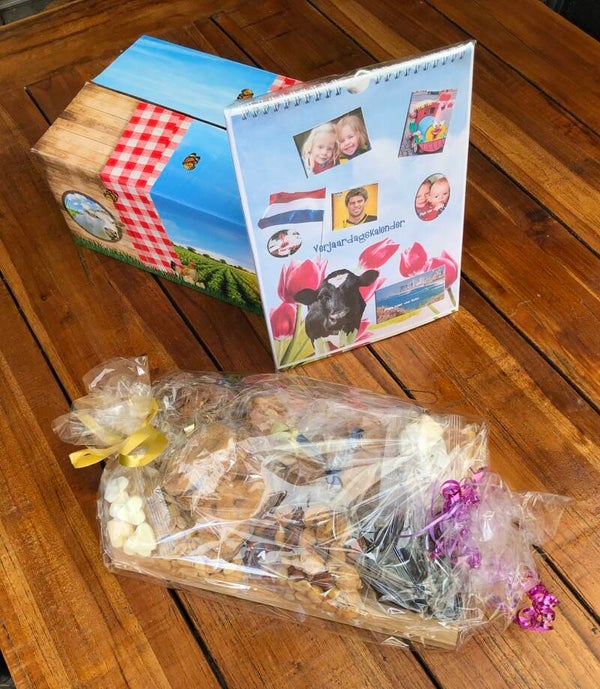 Inhoud: Ambachtelijk gemaakte Eienhouten Borrelplank. Form. L 290xBr.180xH.20 mm 4 Verschillende heerlijke worsten 1 Bijbehorende kaas. 1 Excl. collae verjaaardakalender. Gratis uw naam / bedrijfslogo in de plankgegraveerd